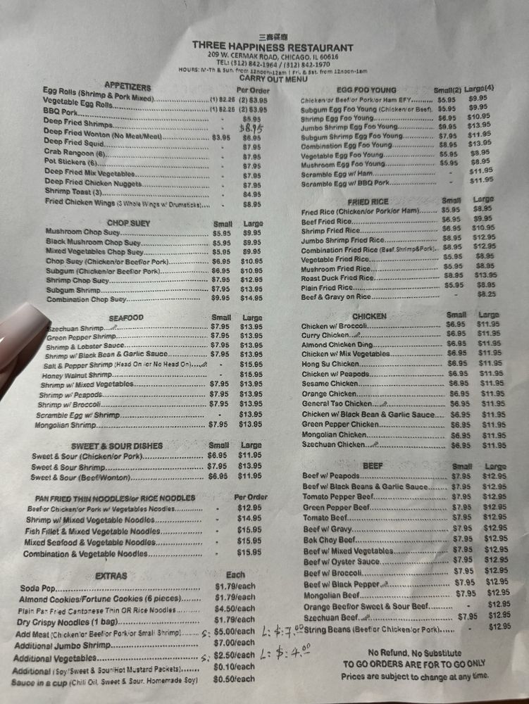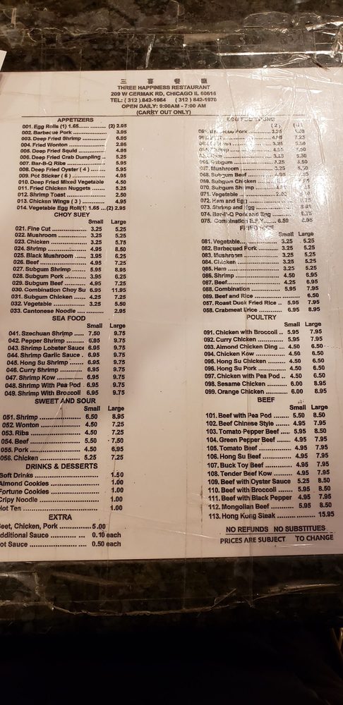 Introducing the menu at Three Happiness, located in Chicago, is an experience filled with authentic Chinese cuisine and a variety of options. From their flavorful egg drop soup to their delicious orange chicken, every dish is prepared with care and attention to detail. The salt and pepper pork chops, shrimp with broccoli, and potstickers are highly recommended by satisfied customers. The restaurant offers many vegetarian choices, making it a great option for all diet preferences. The waitstaff is friendly and efficient, ensuring a pleasant dining experience. Three Happiness also provides convenient services like delivery, takeout, and catering. The atmosphere is cozy, and the prices are fair, making it a popular choice for families, groups, or a casual lunch or dinner. Don't miss out on the opportunity to taste the delightful flavors at Three Happiness.